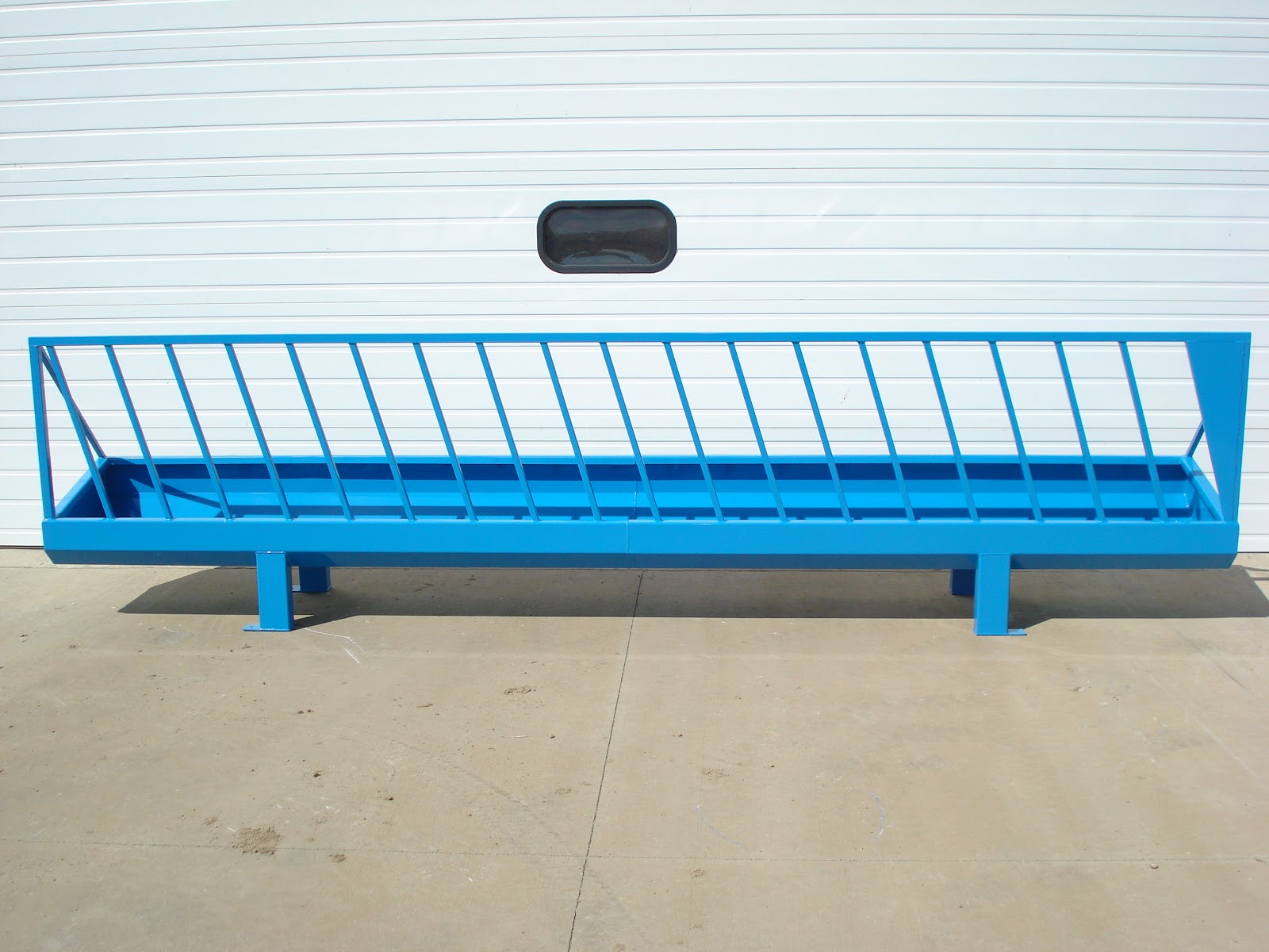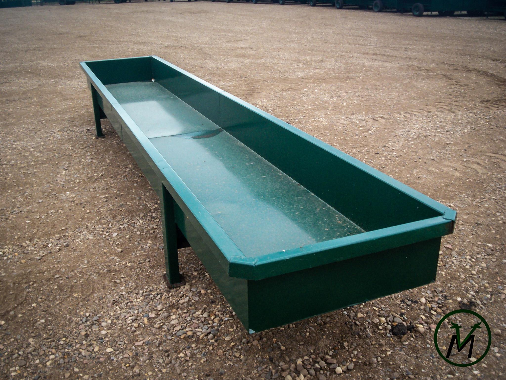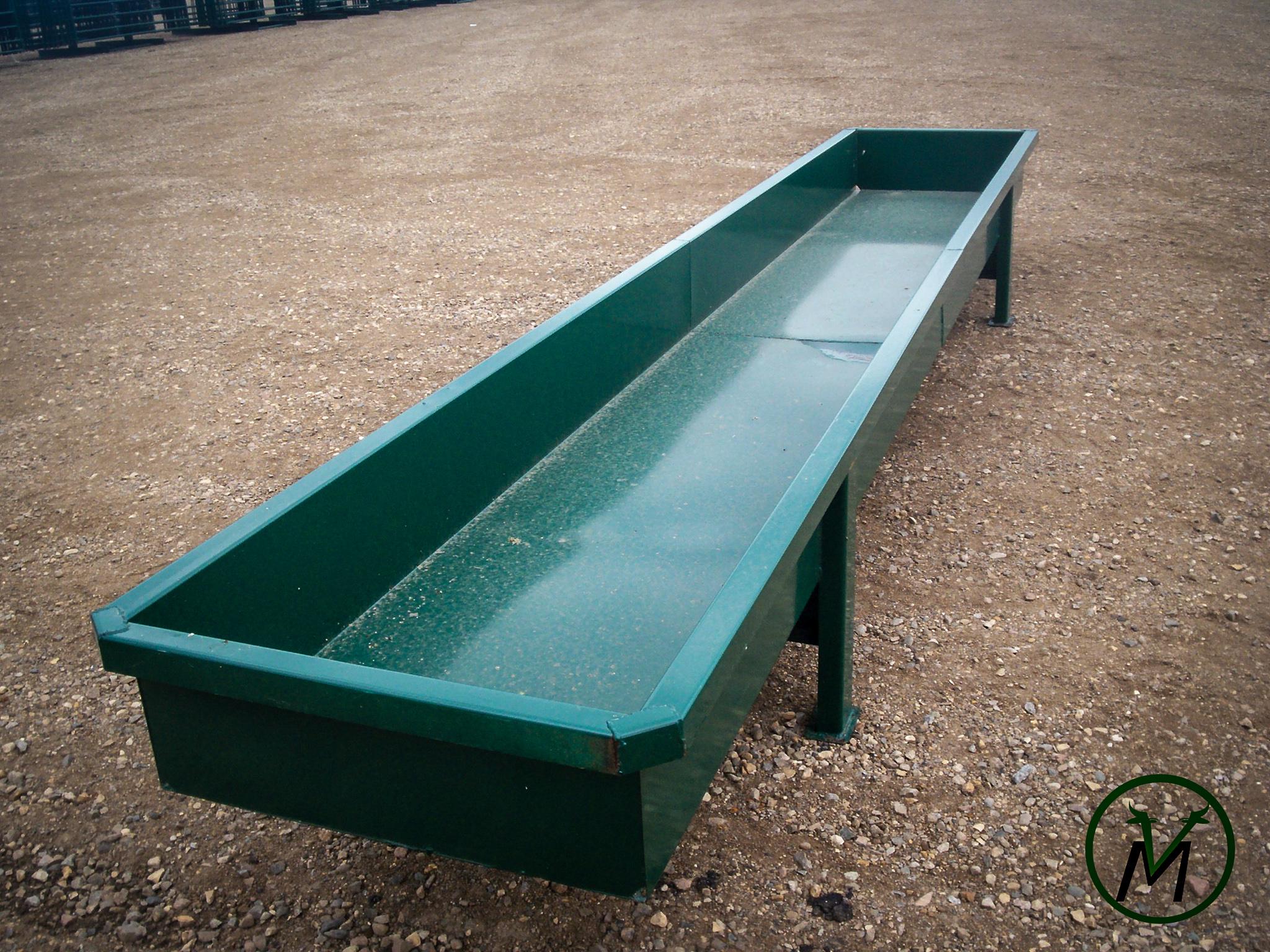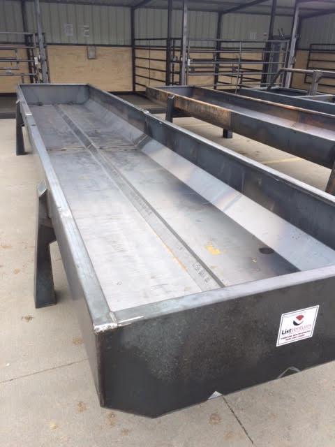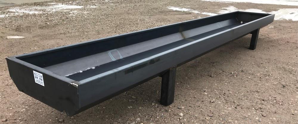 Heavy metal feed bunks are made of 10 gauge sheet material with rectangular tubing legs capped on the top and bottom. Top lip is formed in and down to keep the feed in the bunk. Two drain holes in both ends. Available painted or unpainted. Leg under bunks also available.