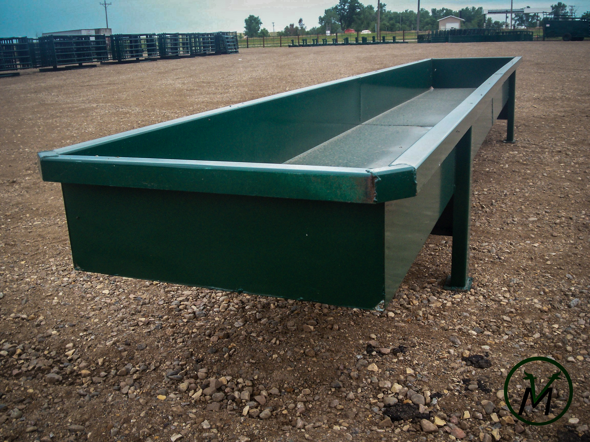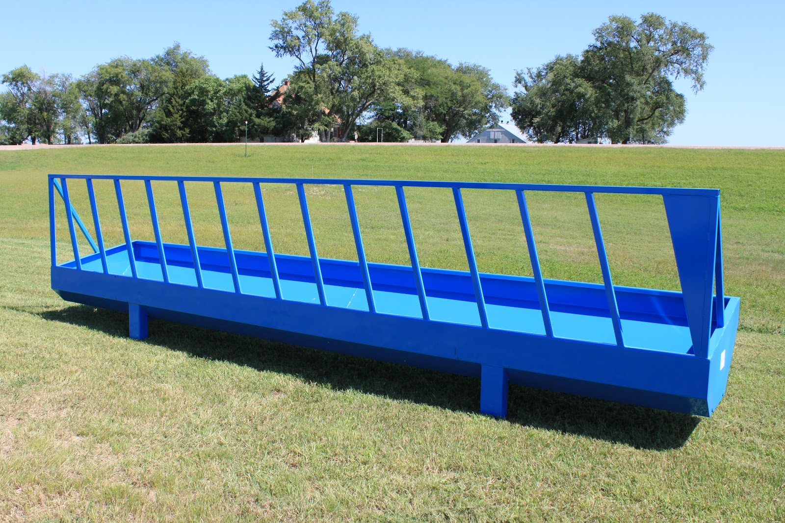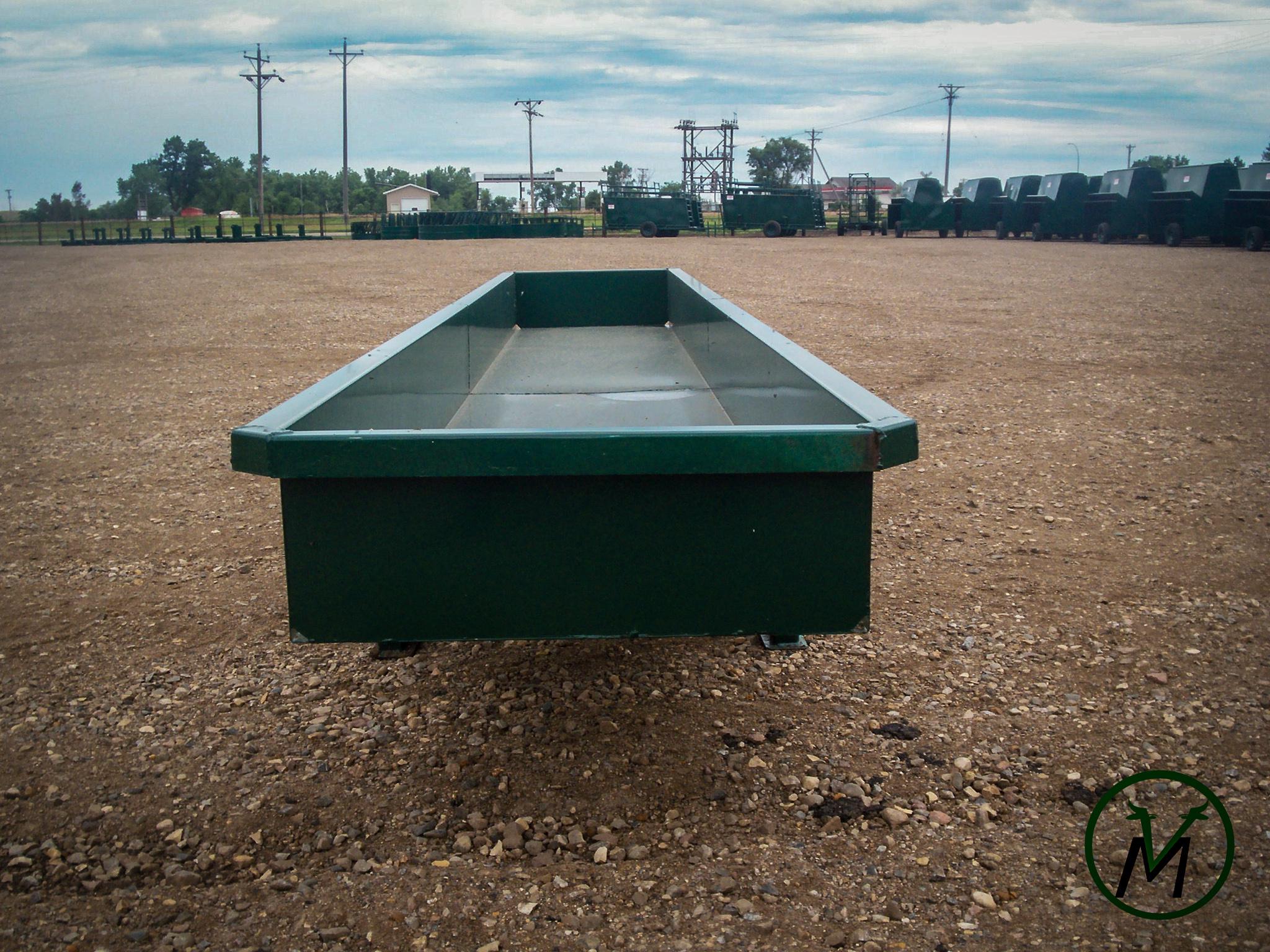 Heavy metal feed bunks are made of 10 gauge sheet material with rectangular tubing legs capped on the top and bottom. Top lip is formed in and down to keep the feed in the bunk. Two drain holes in both ends. Available painted or unpainted. Leg under bunks also available.