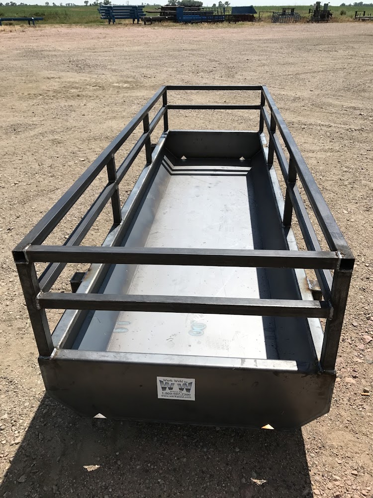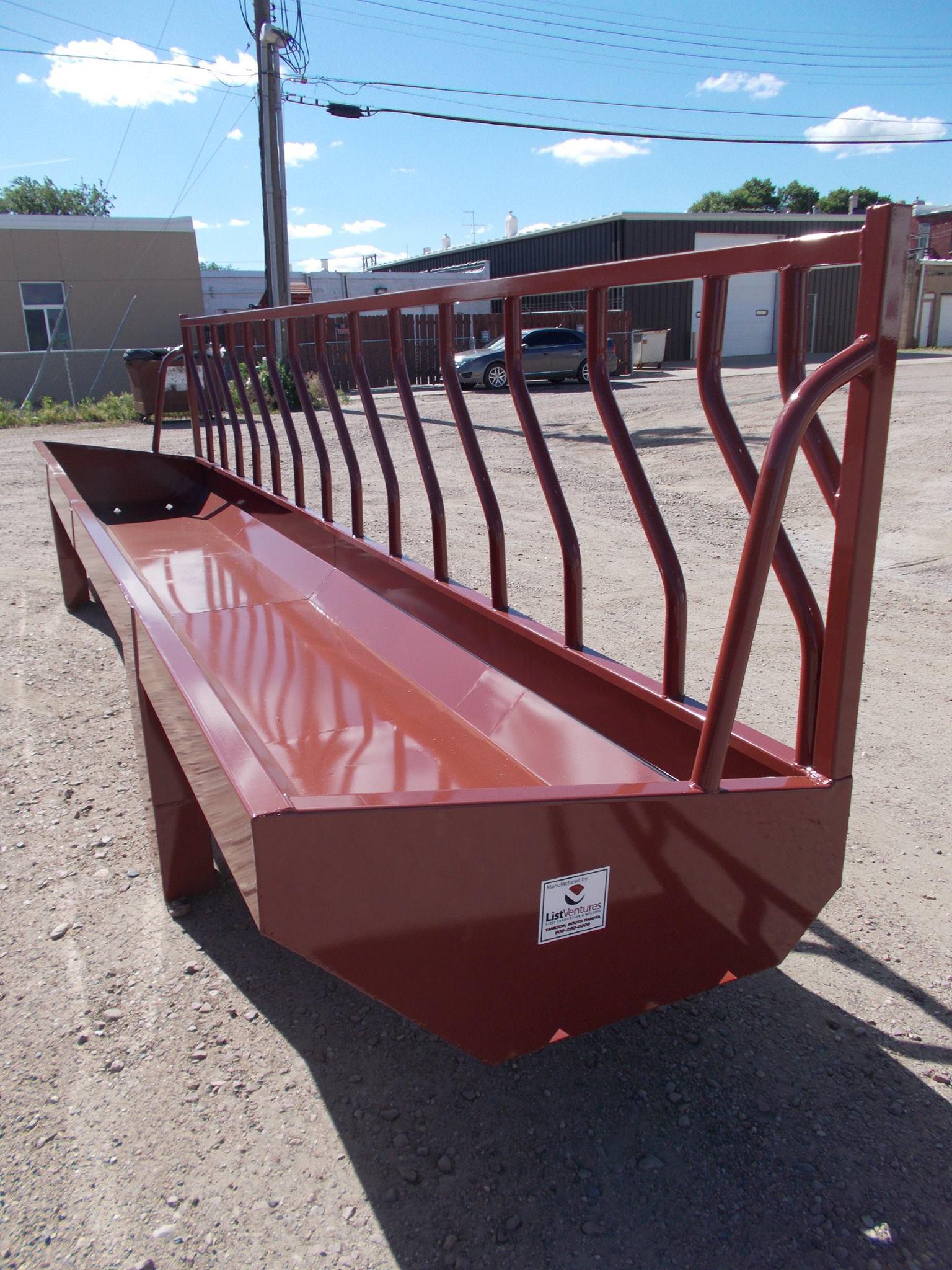 Heavy-duty steel feed bunks in standard, bottomless, fenceline, and sheep styles. Available in multiple sizes from List Ventures, Verns Manufacturing, and Werk Weld. Custom lengths available.